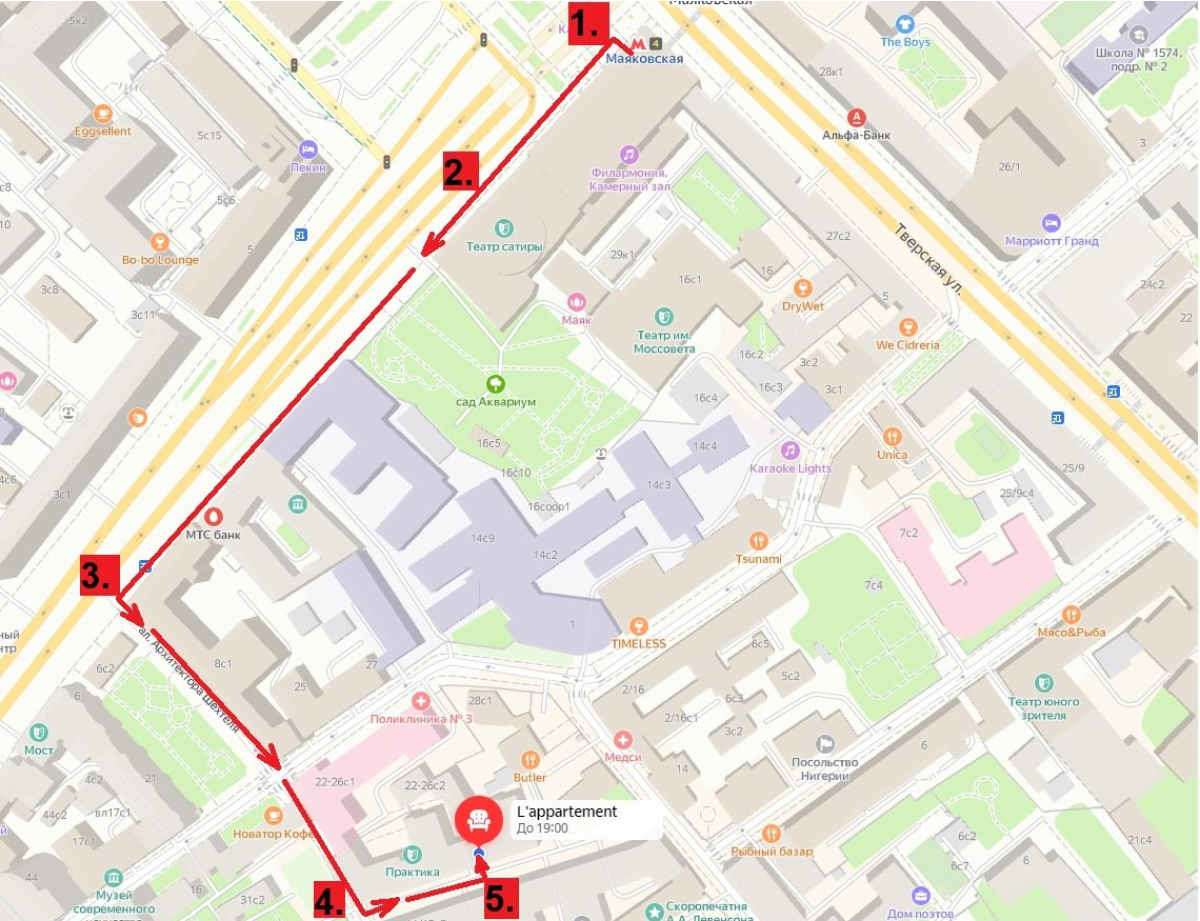 На общественном транспорте:Выходите на остановке "Метро Маяковская", идете по аллея Архитектора Шехтеля 230 метров прямо (в сторону Трехпрудного переулка), поворачиваете налево на Трехпрудный переулок, далее слева 5-ти этажное здание, Вы на месте!