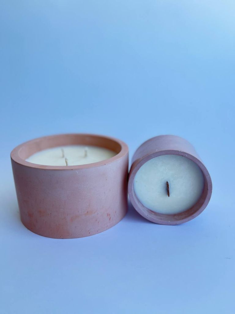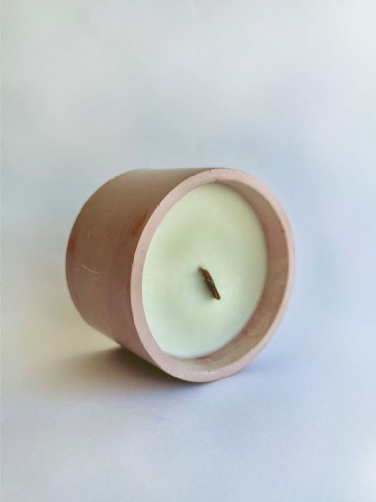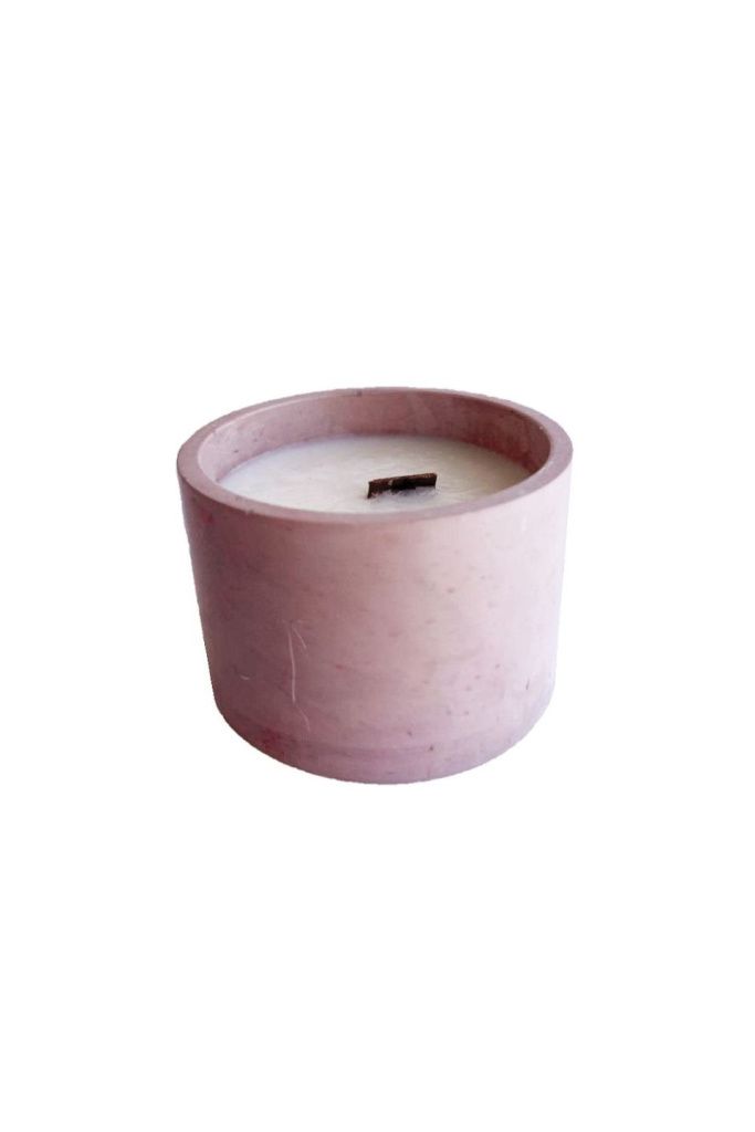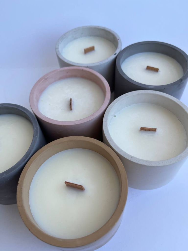 Ароматическая свеча из соевого воска в чаше из бетона и с деревянным фитилем.
