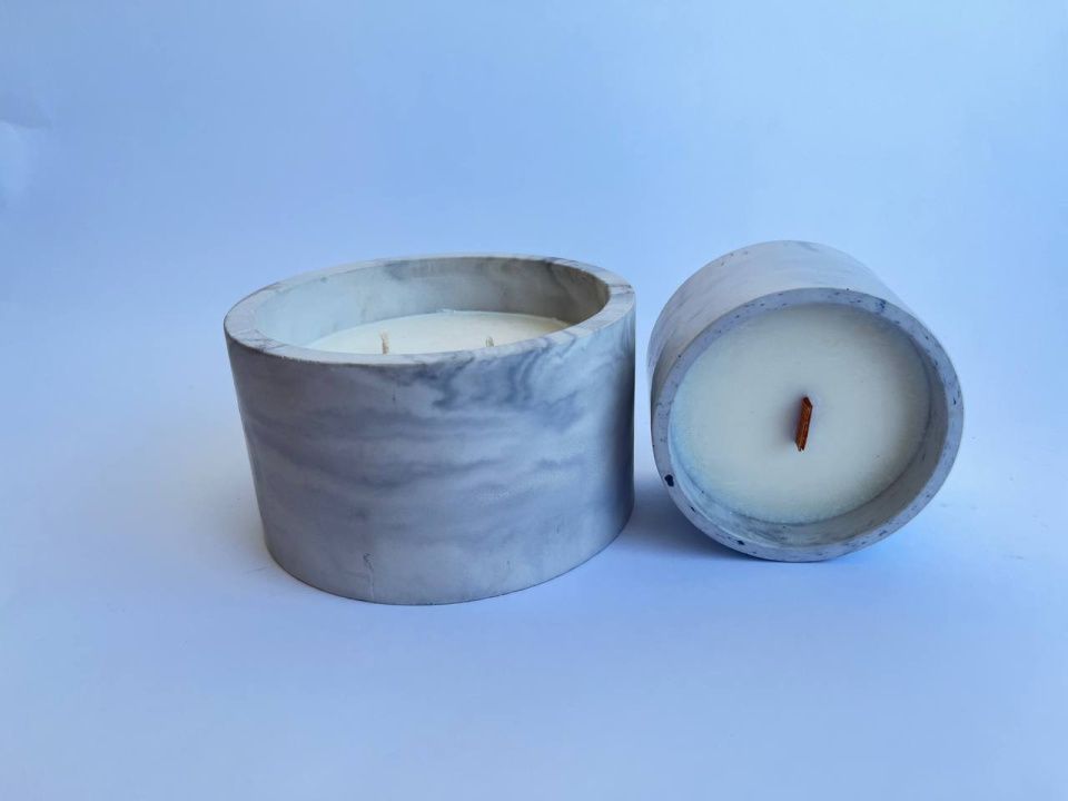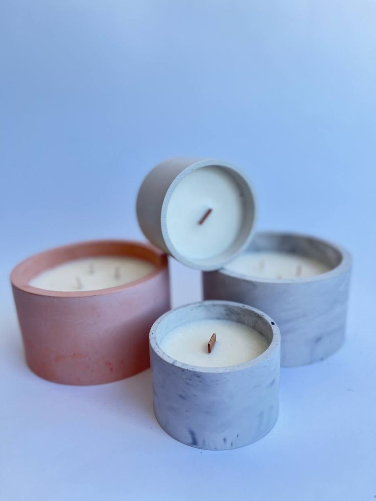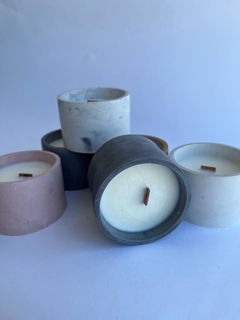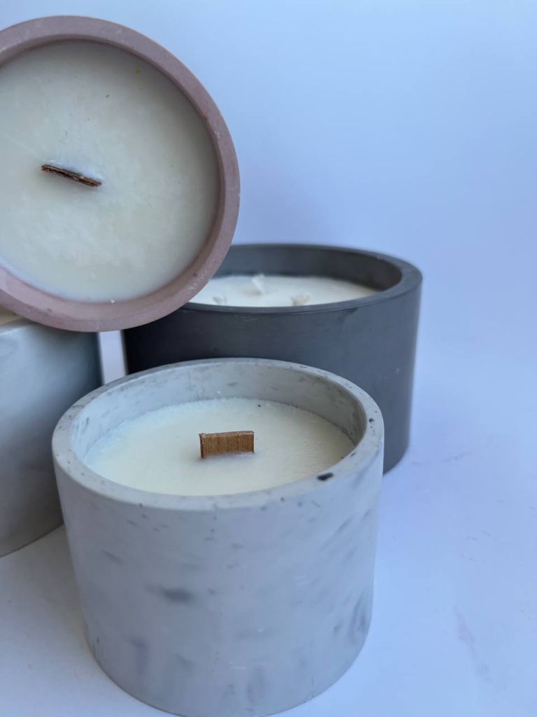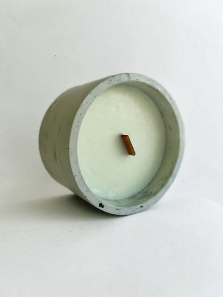 Ароматическая свеча из соевого воска в чаше из бетона и с деревянным фитилем.