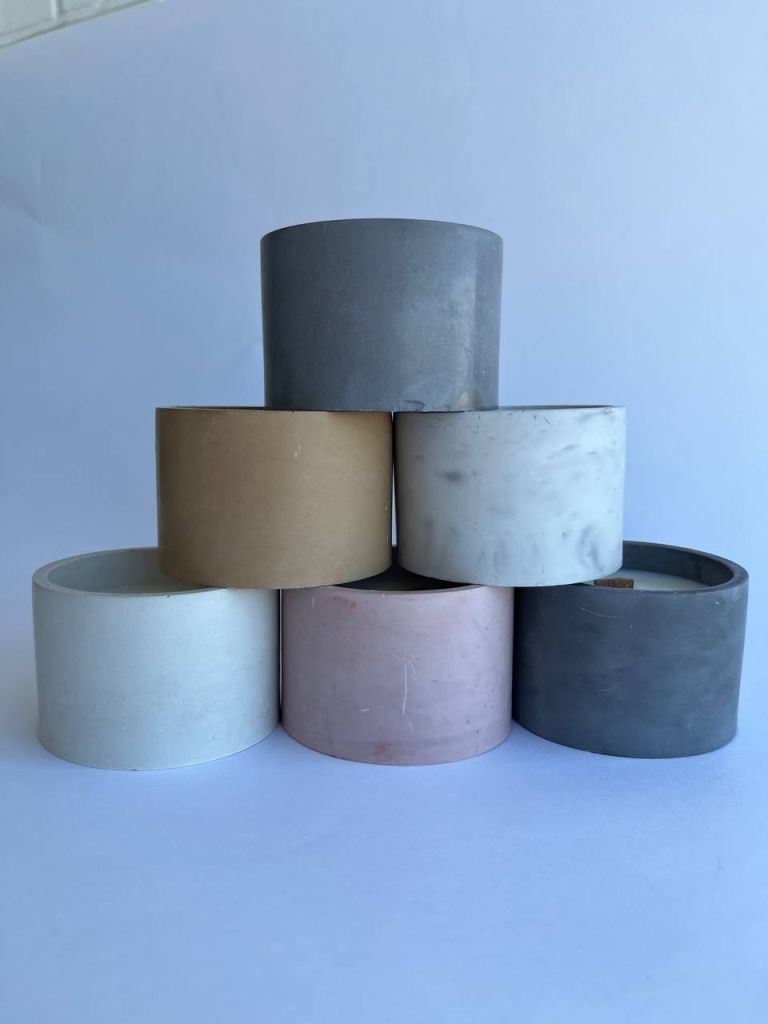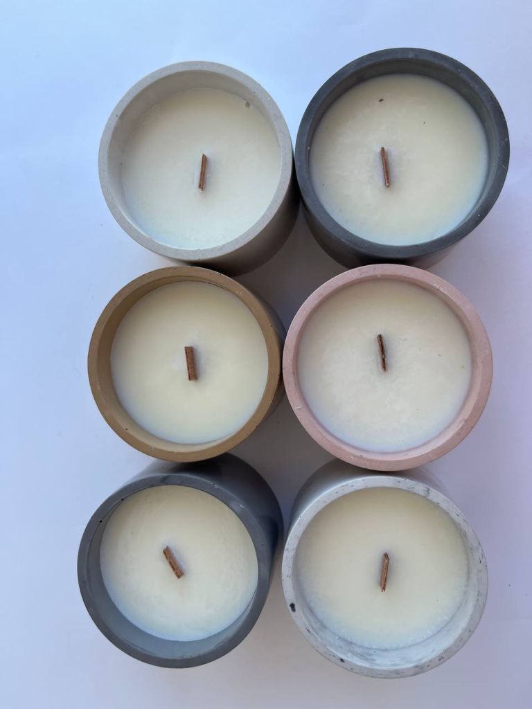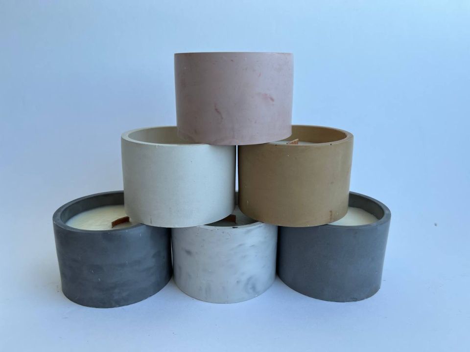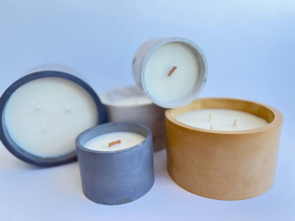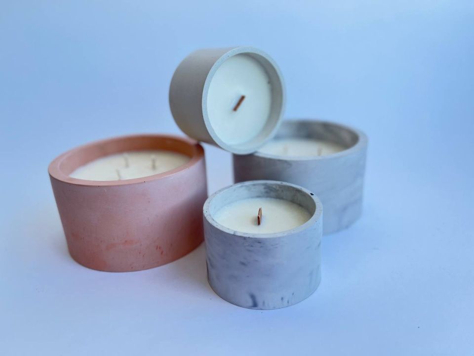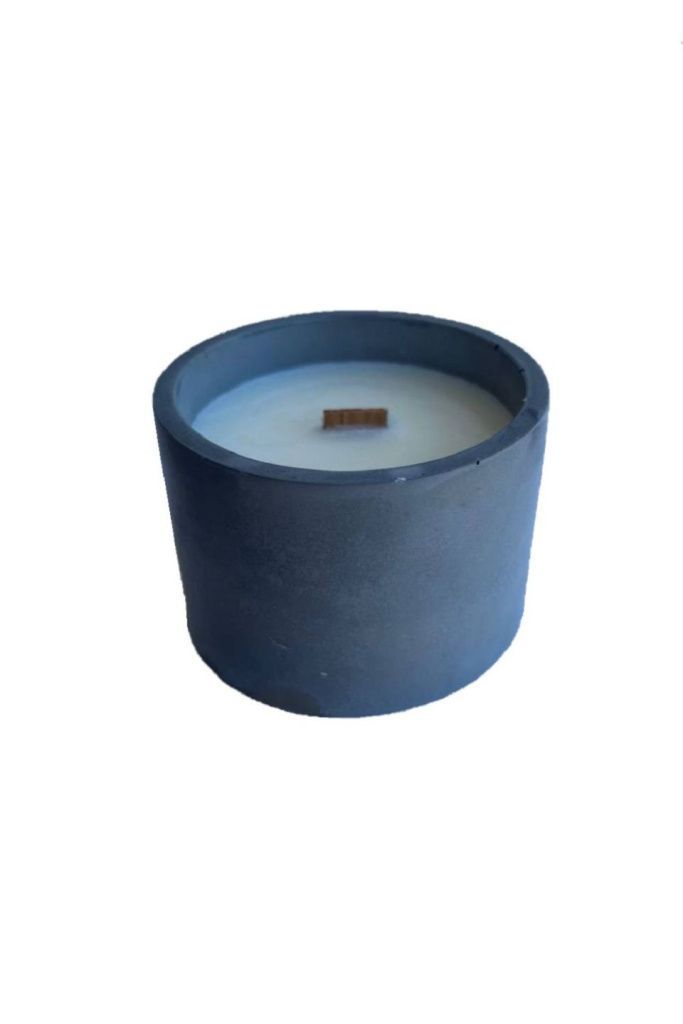 Ароматическая свеча из соевого воска в чаше из бетона и с деревянным фитилем.