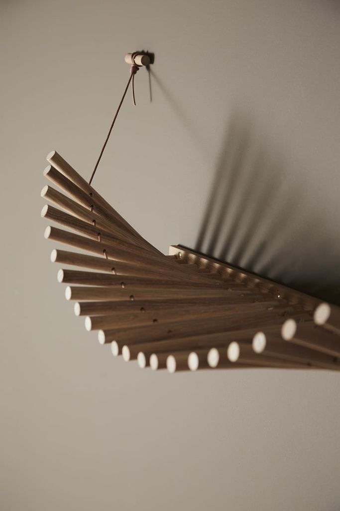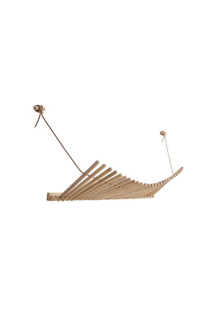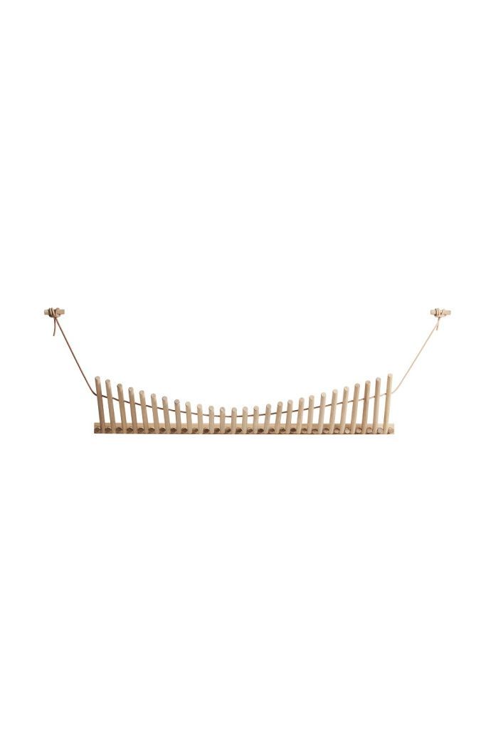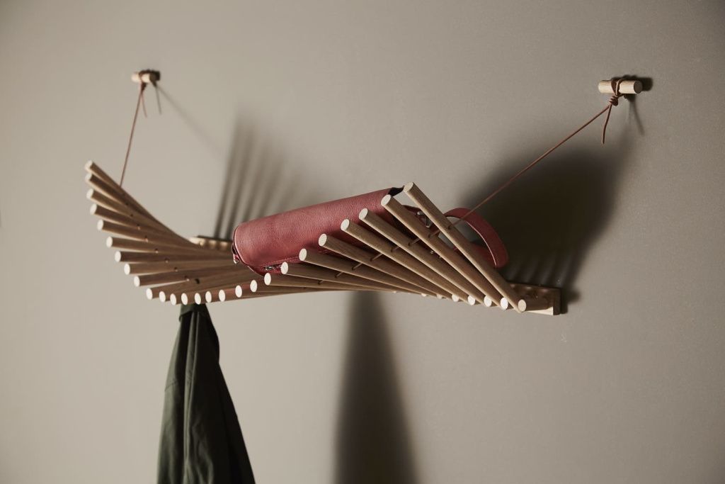 Knaegt — это элегантная и эстетичная вешалка и полка для шляп. Простое чередующееся повторение деревянных палочек, с проходящим через них кожаным шнуром, придает вешалке динамичность, поскольку линия, создаваемая палочками, меняется в зависимости от того, что находится на вешалке. Каждая палочка выполняет функцию вешалки.