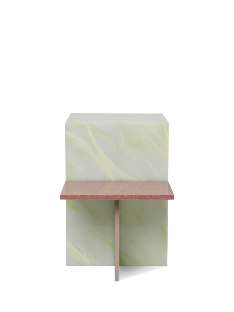 Первоначально вдохновленный японским минимализмом, приставной столик Distinct исследует создание сложных структур на основе одного элемента. Минимализм его конструкции контрастирует с богатством фактур и цветов и напоминает абстрактный неопластицизм, который подчеркивает общую композицию приставного столика. Стол изготовлен из акрилового камня.