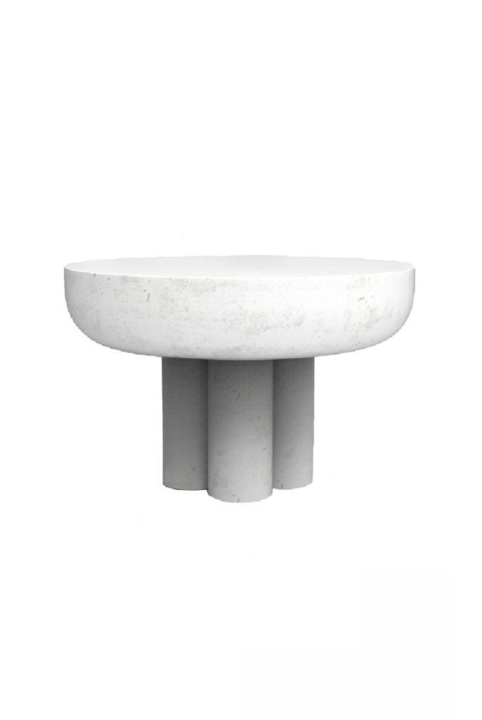 Круглая столешница на четырех цилиндрических ножках. Стильный и сильный стол вдохновлен структурными элементами брутальной архитектуры, прославляющими колонны и избегающими отношения к слишком большому количеству деталей. Массивные фибробетонные ножки обеспечивают большой зазор между краем стола и ножками, чтобы подчеркнуть ощущение массивной плавающей столешницы. Стол доступен в двух размерах и может использоваться как одиночный приставной столик или в компании с другими в качестве журнального столика.