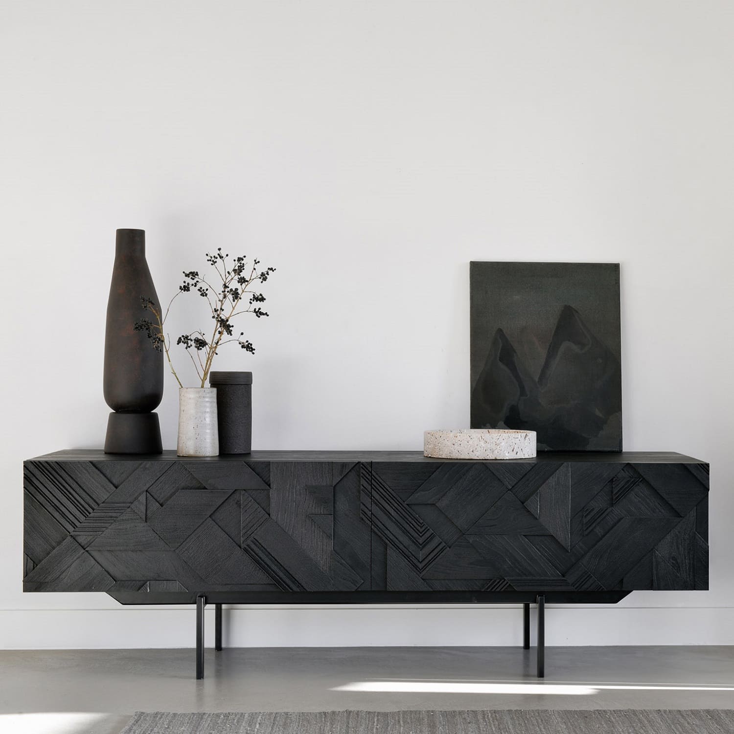 Стремясь придать поверхности динамичность, дизайнер Ален ван Хавр начал комбинировать треугольные формы и накладывать их слоями. Так он создал интересную композицию из тика. В итоге поверхность была обработана брашированием, чтобы подчеркнуть текстуру и ещё больше придать ощущение движения. Этот узор, изначально использованный для популярного буфета Teak Graphic, теперь идеально подходит и для новой тумбы под телевизор.
