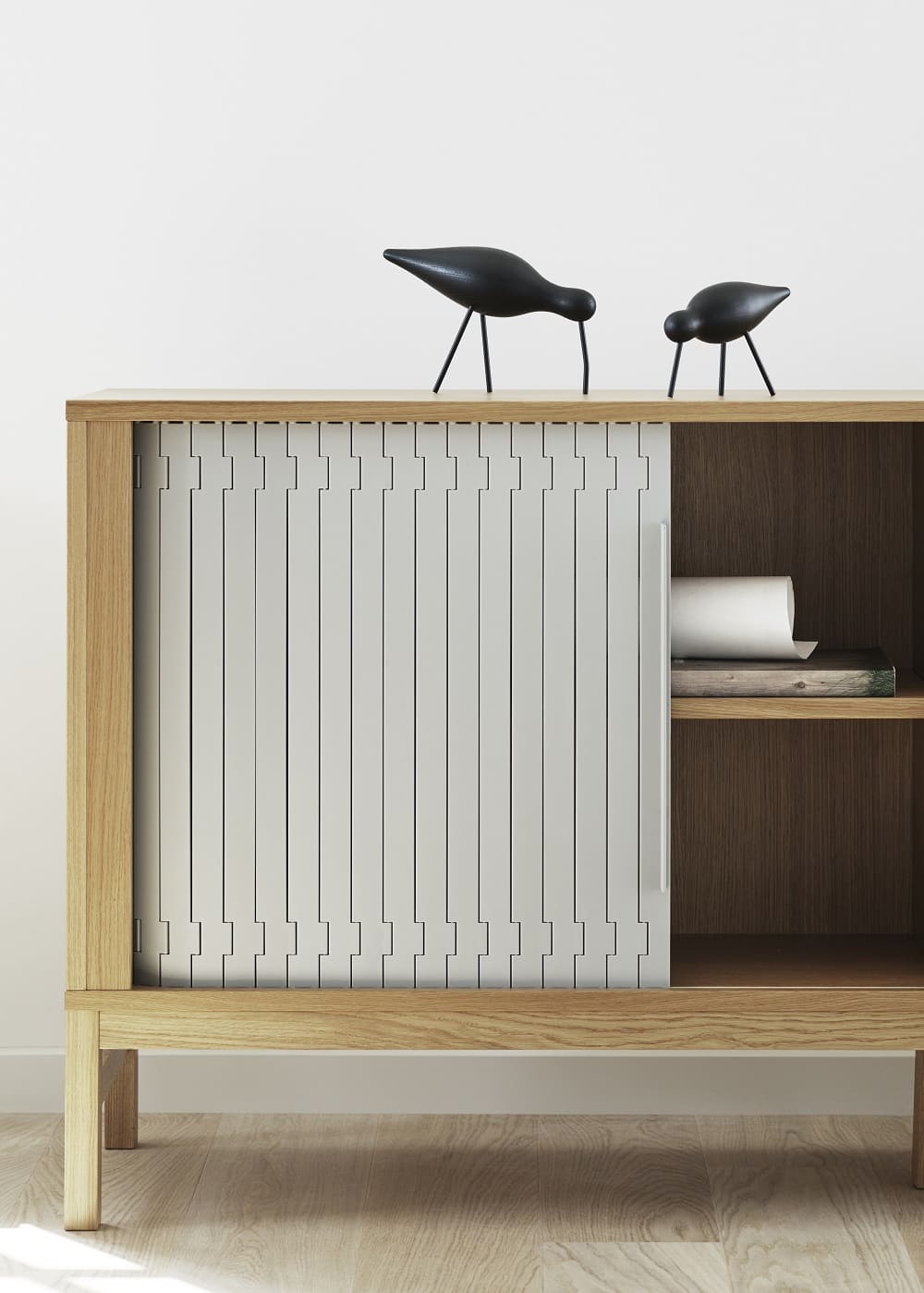 Коллекция Jalousi, состоящая из буфета и шкафов, отличается минималистским стилем и контрастным сочетанием материалов. Во всех проектах представлены практичные рольставни привлекательных цветов. Цветные ставни создают привлекательный контраст с корпусом шкафа из дубового шпона с ножками из массива дуба. Сочетание материалов и графическое повторение элементов ставни делают стиль молодым и брутальным.