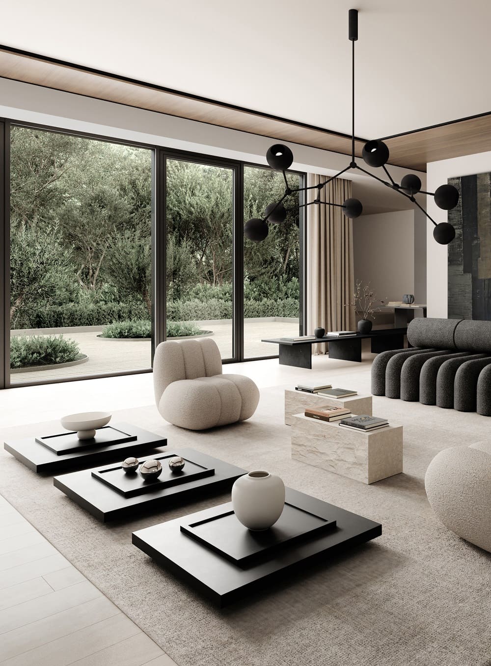 Подиум — это способ создать атмосферу галереи, разместив дома любимые предметы искусства или экспонаты. Богатый архитектурными элементами подиум из известняка напоминает архитектурные фасады, создавая игру тактильных и полированных поверхностей.