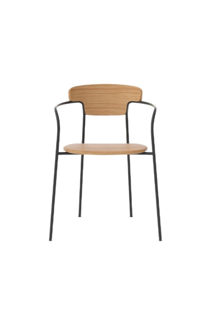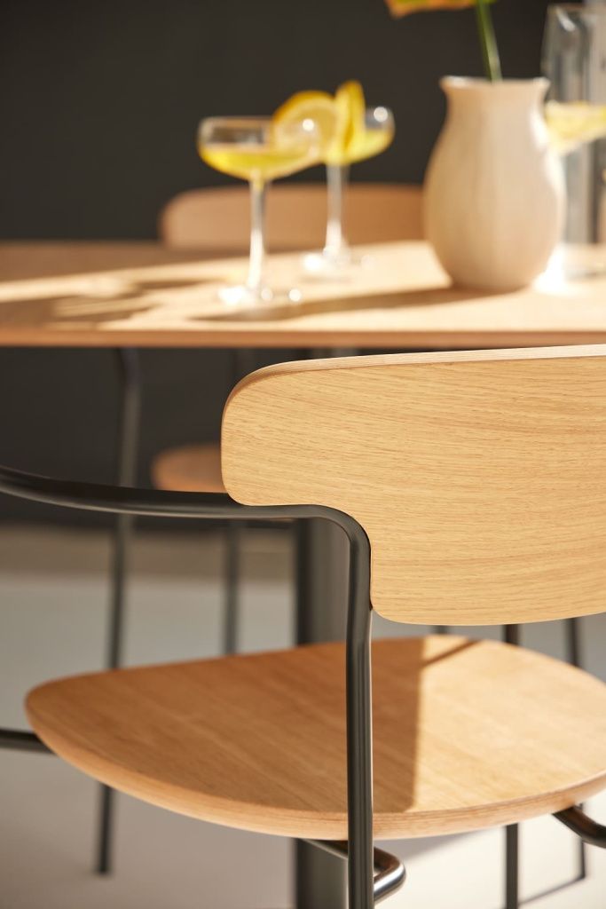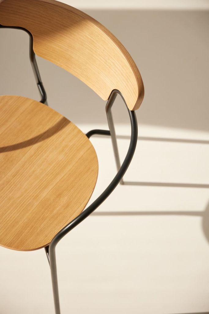 «Линия металла элегантно охватывает стул от подлокотников до деревянной спинки. Два дубовых элемента (сидение и спинка) контрастируют с тонким металлическим основанием, что характеризует силуэт конструкции», — объясняет дизайнер Себастьян Херкнер. Ему удалось создать минималистский стул с ярко выраженной индивидуальностью, что является фундаментальным для Punt. Универсальный предмет, который можно адаптировать к любому дизайну интерьера: от гостиной до кухни, ресторана или офиса. Легкая и тонкая стальная конструкция контрастирует с обрамляющим ее деревом. В дополнение к эстетике, его эргономика и возможность штабелирования была проработана для вашего удобства.