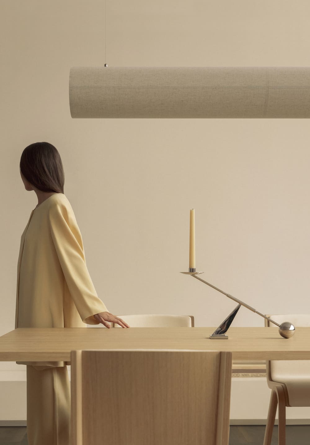 Подвесной светильник Hashira Linear Pendant Lamp, призванный привнести в пространство умиротворение и изысканность, идеально подходит для размещения над обеденным или письменным столом. Он переосмысливает популярную коллекцию светильников благодаря своей горизонтальной форме, обеспечивая рассеянное освещение в минималистичной эстетике. Обтекаемая форма светильника словно парит в воздухе, подвешенная к потолку на тросах, а его абажур из грубого льна фиксируется магнитами, что исключает необходимость использования громоздких винтов. Регулируемый сменный светодиодный источник света излучает тёплый свет, достаточно яркий для выполнения задач, но при этом достаточно мягкий, чтобы создать уютную атмосферу.