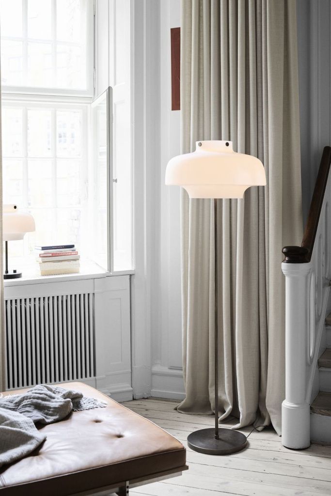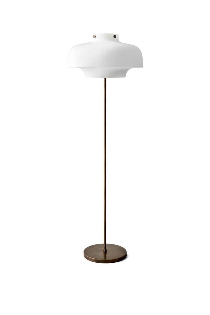 Торшер Copenhagen & TRADITION - атмосферный и элегантный светильник со встроенным регулятором интенсивности освещения для создания уютной атмосферы. Цвет: плафон - молочный, основание - бронзированная латунь
