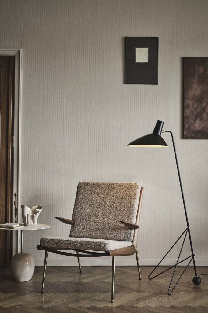 Торшер Tripod HM8 от &TRADITION отражает чистый минимализм старой школы дизайнеров Hvidt & Mölgaard образца 1953 года. Напольная лампа, изготовленная из лакированной стали, снабженная латунными деталями, отражает тонкий баланс между резкой простотой ее конструкции и мягкостью, которую демонстрируют изогнутые края её основания. Хотя торшер был разработан в 1953 году, сейчас он впервые находится в производстве.
