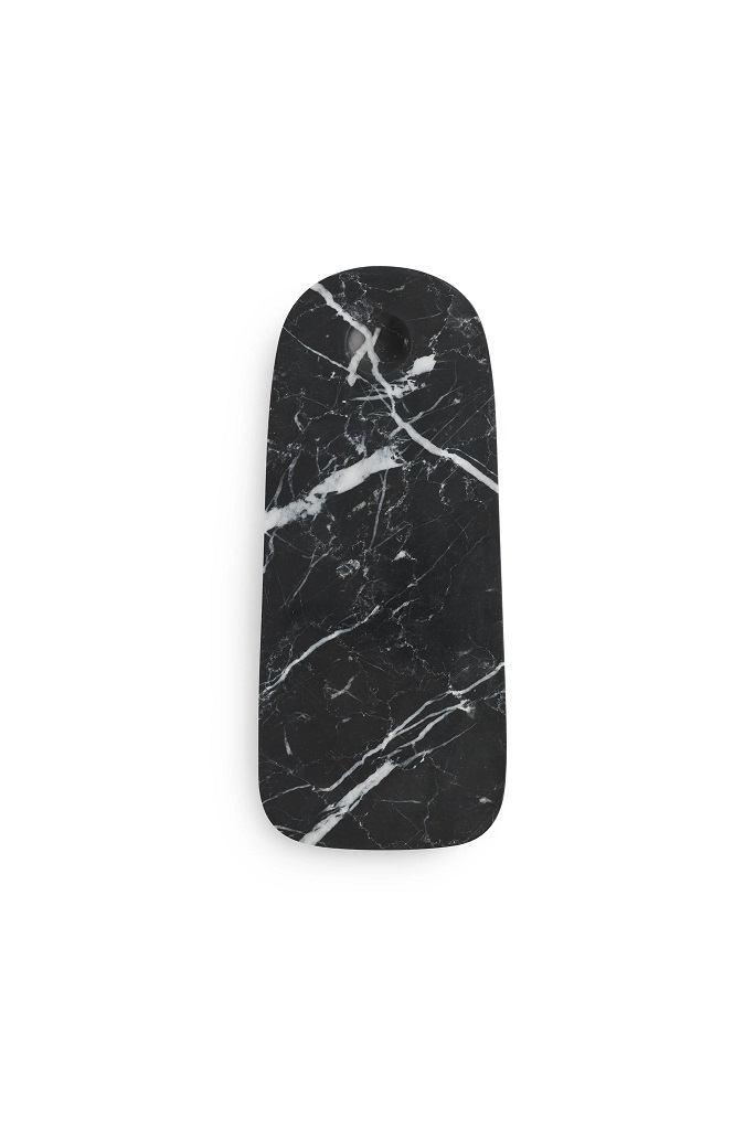 Доска разделочная мраморная Pebble Board, предназначенная для подачи сыров и закусок, изготовлена из черного мрамора и имеет простую, органическую форму с закругленными краями и небольшим углублением с одной стороны.