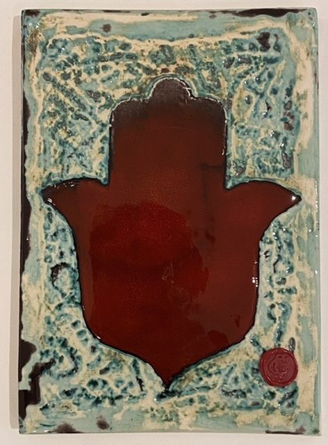Панно керамическое Ладонь Красная на голубом фоне 25х19