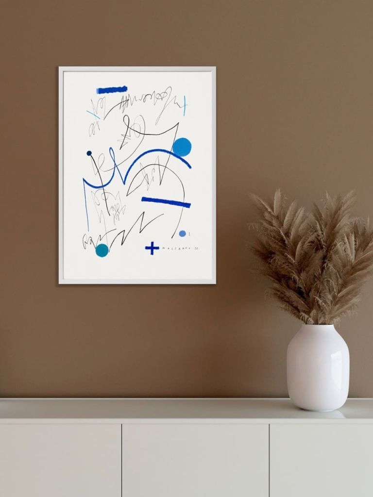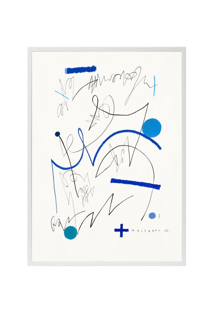 Работа входит в серию «Контрасты». Её композиция построена на контрасте форм и толщин линий, благодаря чему появляется ощущение динамики и эстетичного хаоса. Сочетание оттенков синего и большого свободного пространства листа наполнено воздухом.