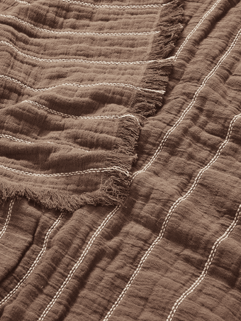 Изготовленное из 100% органического хлопка, сертифицированного GOTS, покрывало Aires станет непринужденным, но изысканным дополнением к вашей спальне или жилому пространству. Искусно сконструированное с использованием техники двойного плетения, оно соединяет два отдельных слоя ткани в процессе плетения, создавая слегка гофрированную и неровную текстуру поверхности. Этот дизайн обеспечивает нежное, воздушное прикосновение, обеспечивая при этом тепло благодаря своему двухслойному плетению. Тонко сотканная контрастная полоса и нежные края с бахромой добавляют дополнительный визуальный интерес. Стилизуйте его как покрывало или накиньте на диван, чтобы создать уютное гнездышко.