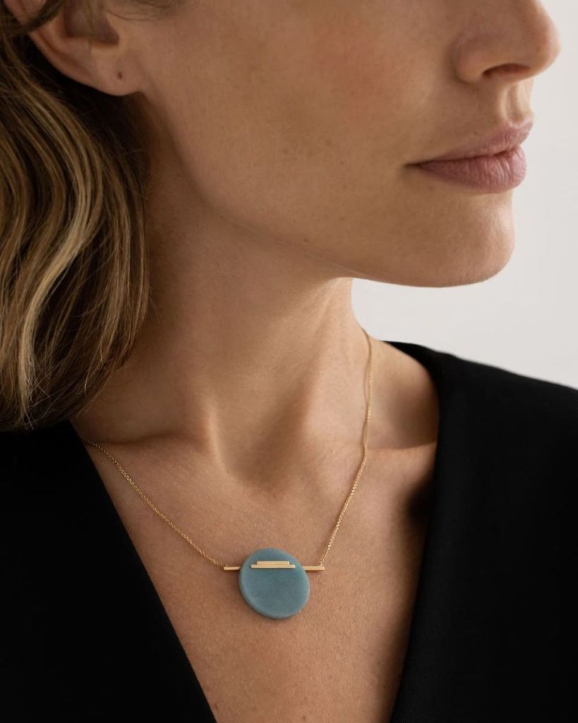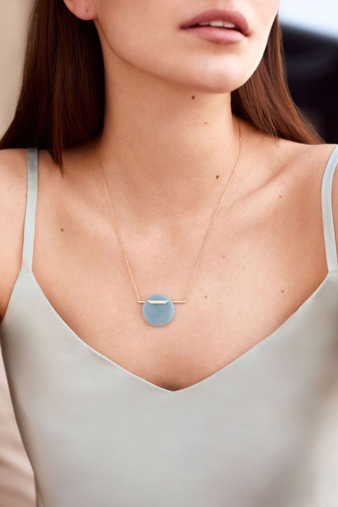 Идеальная форма круга стала основой для этого колье. Голубой кварц с необычными включениями пересекается с тонкой золотой линией, словно пронизывающей окружность в своём движении.