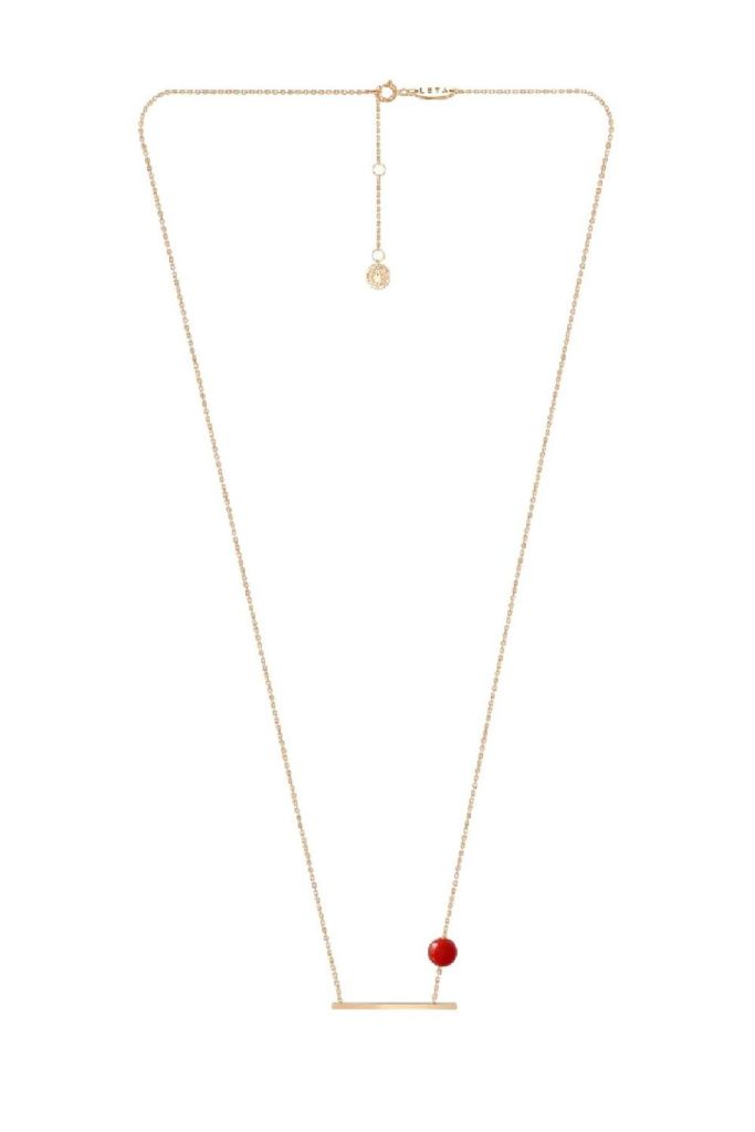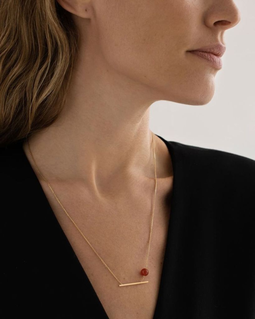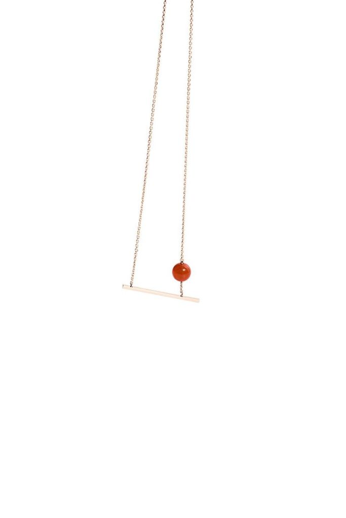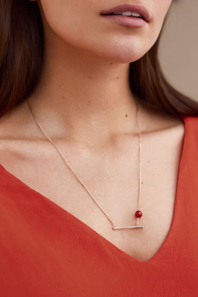 Лёгкое колье с каплей красного оникса, словно парящей на тонкой цепочке, напоминает о том, что пространство супрематического произведения не зависит ни от чего, включая силу притяжения.