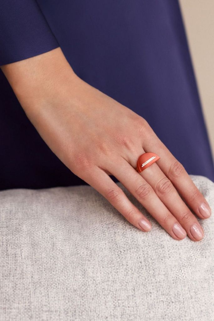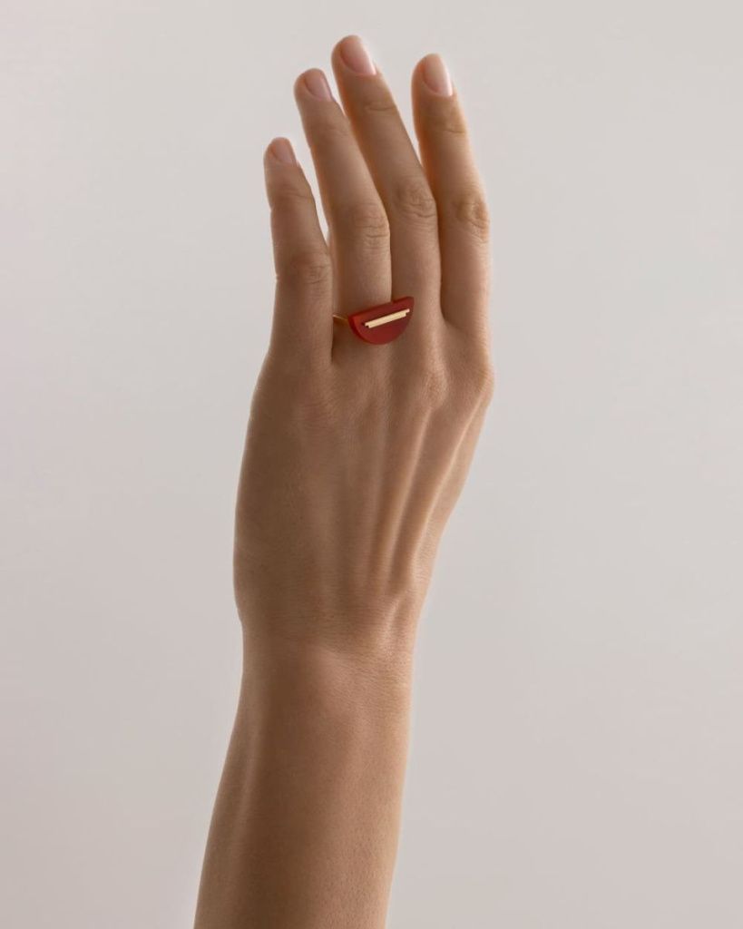В основе этого кольца – графичный полукруг из красного оникса. Согласуясь с основными идеями супрематизма, его чистая форма намеренно лишена любых контуров – камень полностью открыт со всех сторон. Две линии из золота соломенного цвета дополняют и уравновешивают композицию.