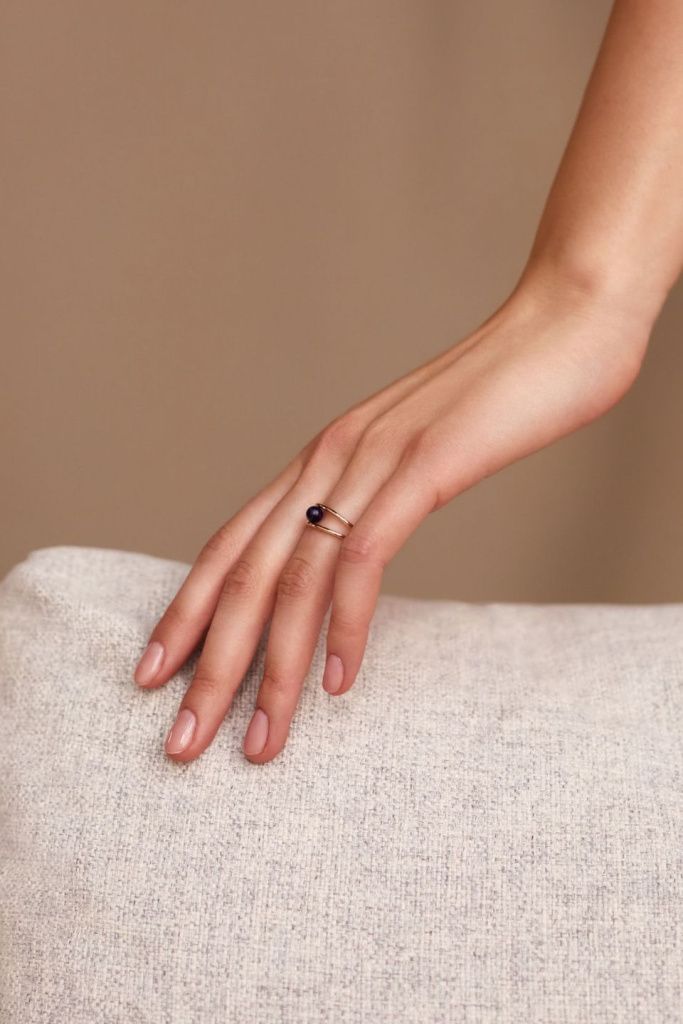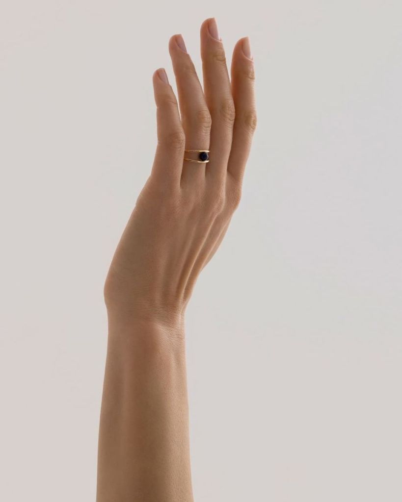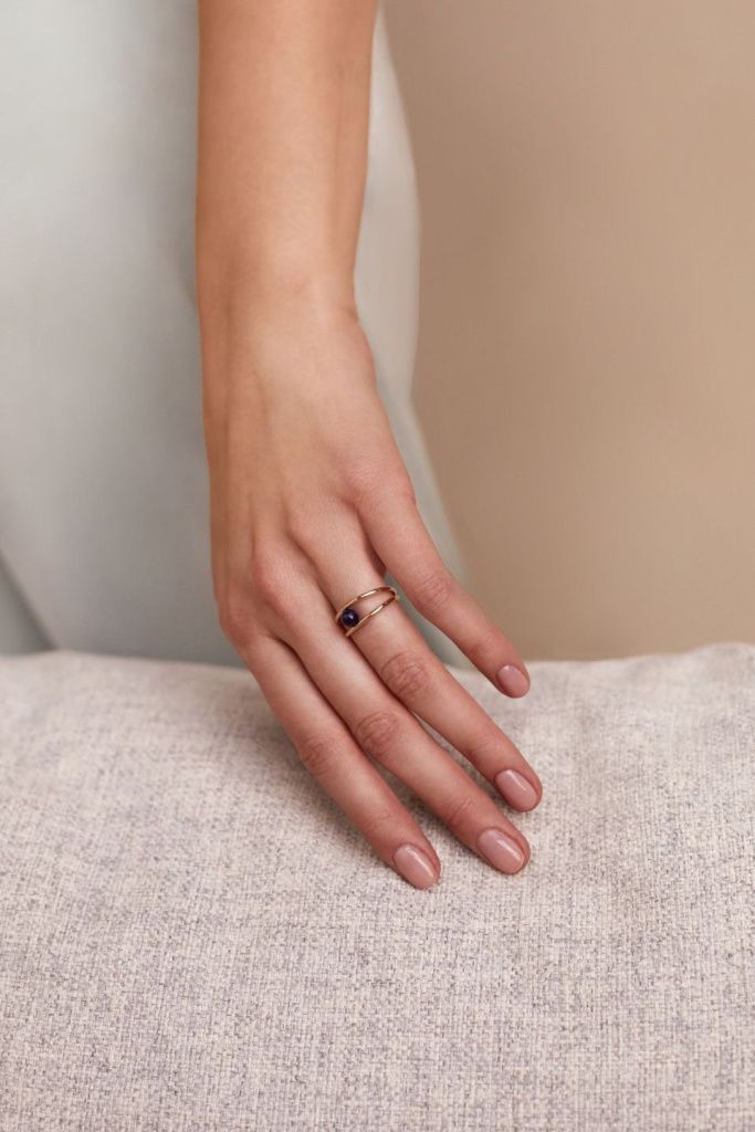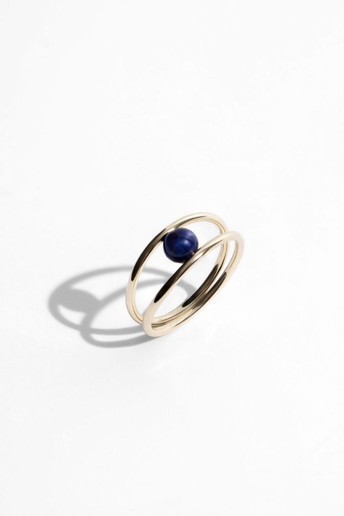 В практически невесомом кольце капля глубокого синего содалита словно парит между двумя тонкими золотыми линиями, напоминая о том, что пространство супрематического произведения не зависит ни от чего, включая силу притяжения.