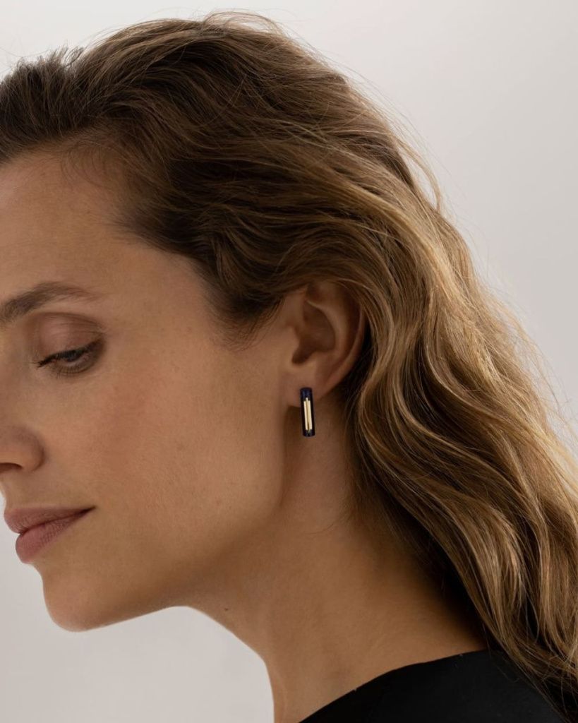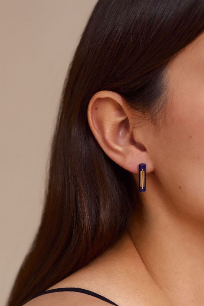 Основа композиции этих серёг – вытянутый содалит глубокого синего цвета. Согласуясь с основными идеями супрематизма, его чистая форма намеренно лишена любых контуров – камень полностью открыт со всех сторон. Три линии из золота соломенного цвета дополняют и уравновешивают композицию.